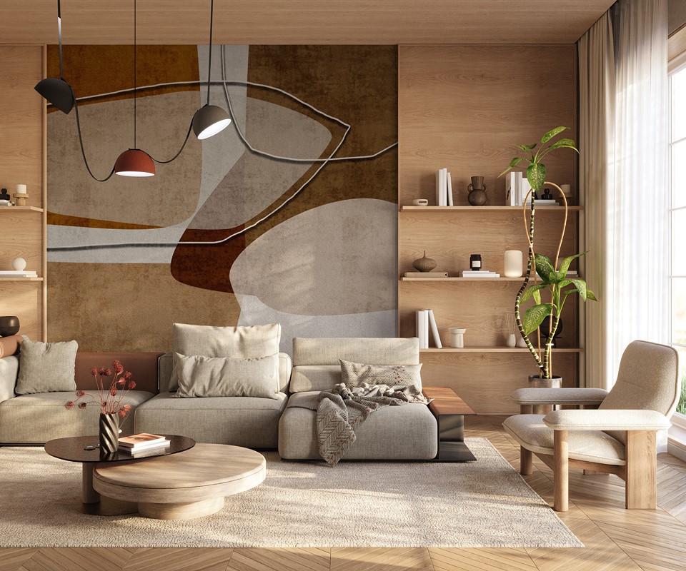„Abstraktní tvary“ je jemná kompozice geometrických a plynulých forem, provedená v tlumených tónech hnědé a bílé. Jemné prolínání křivek a úhlů dělá z obrazu magnetický bod interiéru – přitahuje pohled, ale nedominuje celému prostoru. Tato barevná paleta umožňuje snadnou kombinaci s mnoha styly interiérového designu a barevnými paletami.