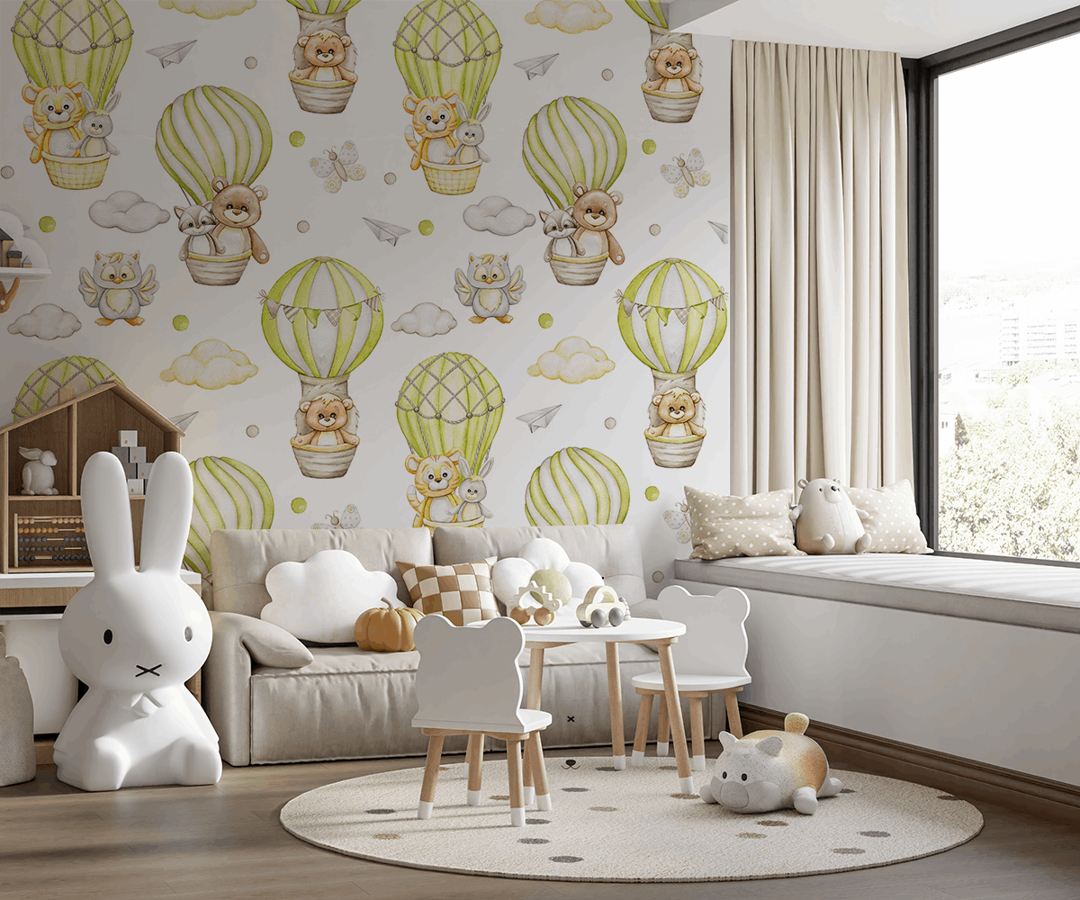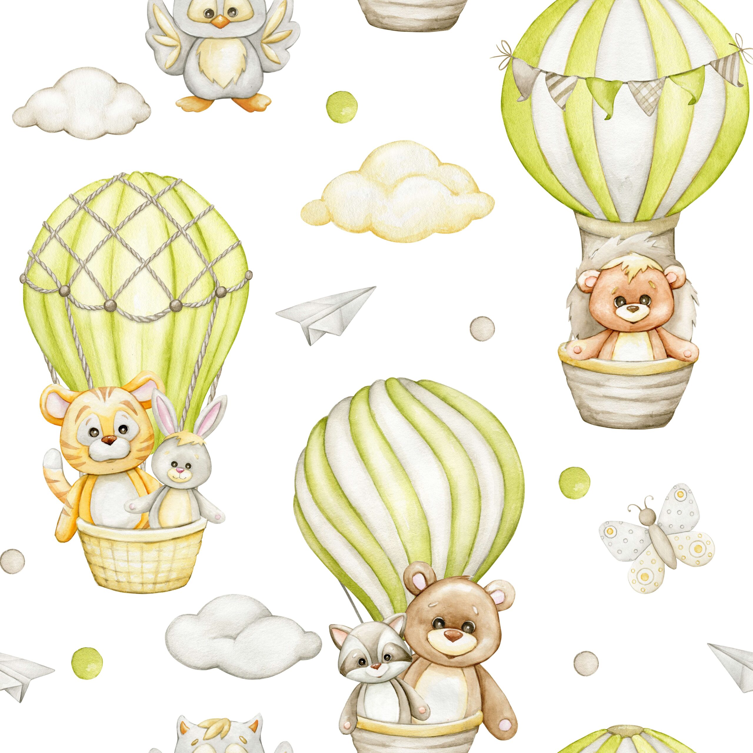 Ponořte se do kouzelného světa dětské fantazie s fototapetou „Balónková dobrodružství malých přátel“. Tento okouzlující vzor zobrazující přátelská zvířátka cestující v balóncích mezi mraky, papírovými letadly a motýly vytváří atmosféru bezstarostného dobrodružství a radosti. Tlumené barvy s pastelovými akcenty dělají z této tapety perfektní volbu do každého dětského prostoru.
