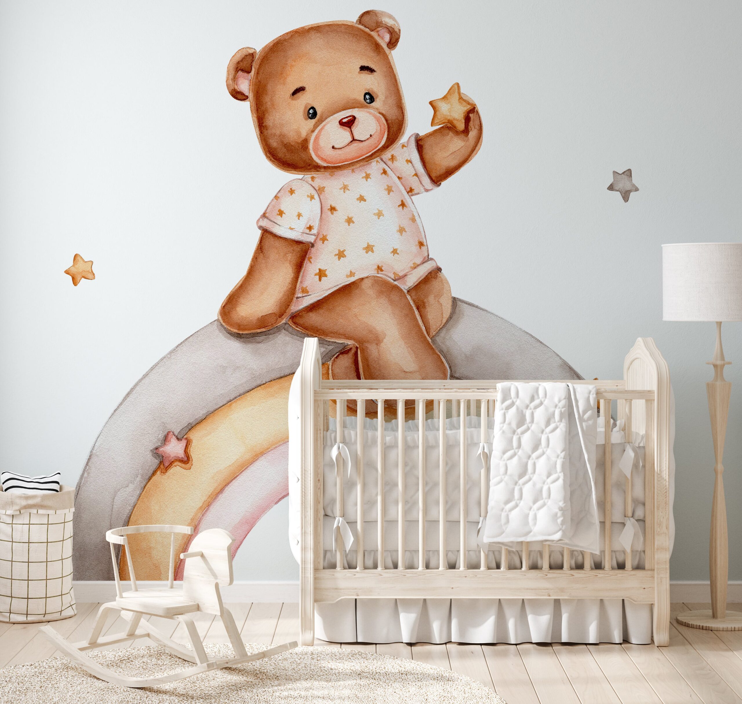 Vneste do svého domova trochu magie a radosti s fototapetou „Duhový svět medvídků“. Tento okouzlující, barevný vzor zobrazuje medvídka na cestě po kouzelné duze a rozzáří prostor teplem a optimismem. Barevné mraky, hvězdy a duha vytvářejí pohádkovou atmosféru, ideální do dětského pokoje.