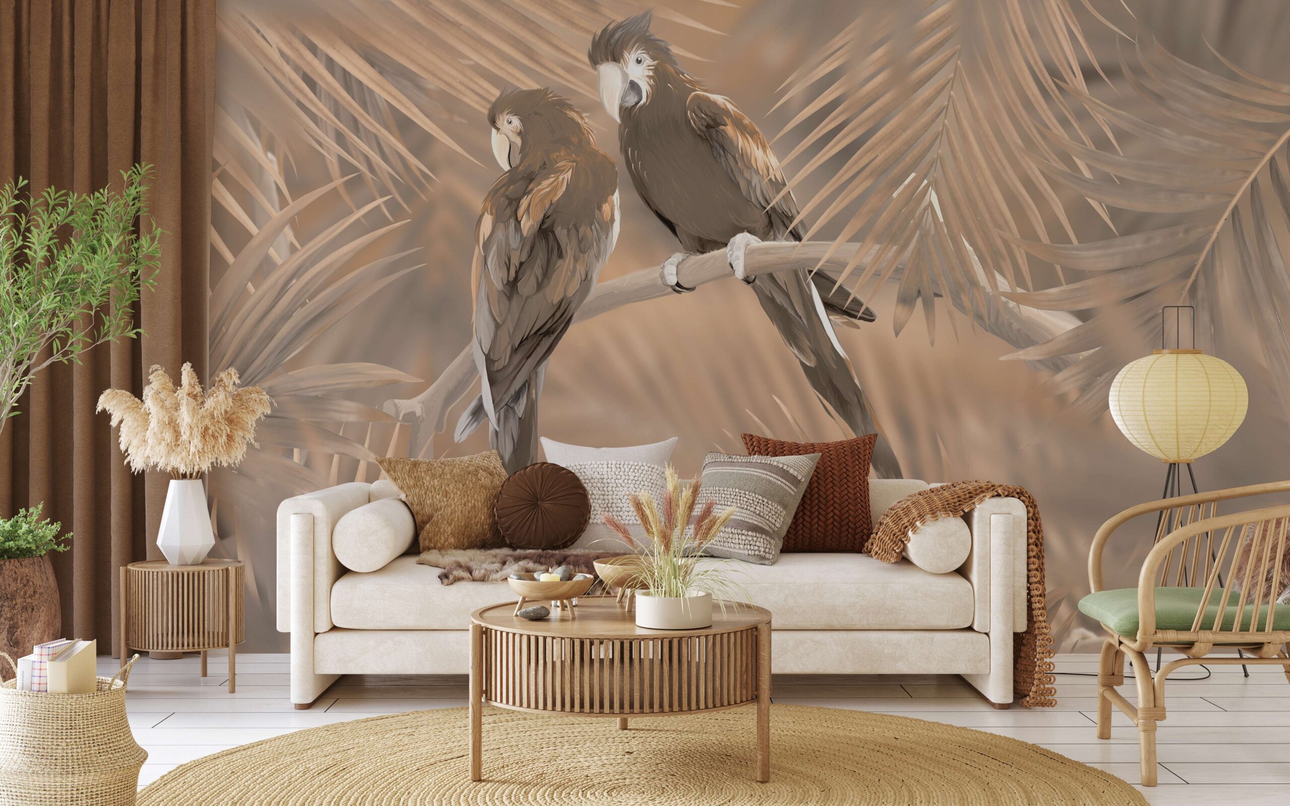 Vneste do svého interiéru nádech exotiky a klidu s fototapetou „Exotické setkání“. Ilustrace dvou papoušků sedících mezi jemnými palmovými listy vytváří kompozici plnou přirozeného kouzla a harmonie. Tlumené béžové a hnědé barvy dodávají celku vznešený, uklidňující charakter.