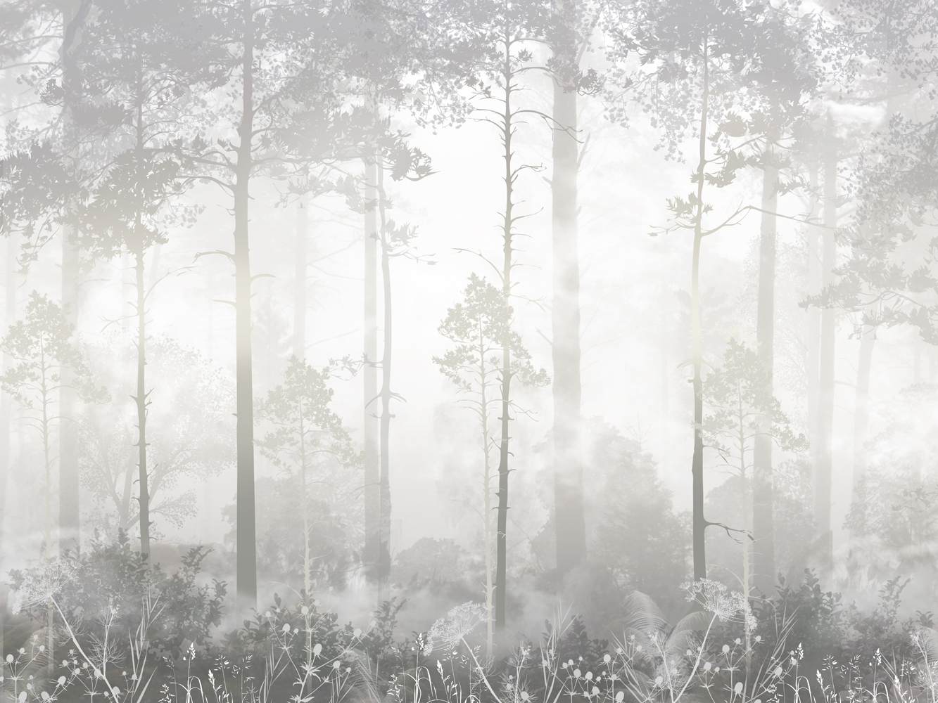 Světlé, tlumené barvy založené na odstínech bílé, šedé a jemné zelené dělají z fototapety Mlžný les dokonale rozjasňující interiér a opticky jej zvětšující. Motiv mlžného lesa vnáší přirozený rytmus a pocit blízkosti přírody a dokonale doplňuje skandinávské, japonské, minimalistické a moderní interiéry.