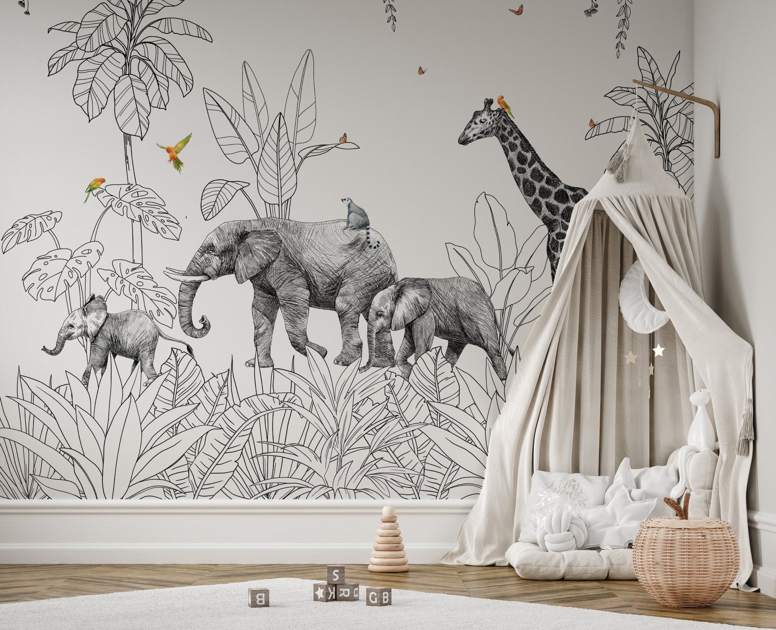 Ponořte se do nevšedního světa divoké přírody s fototapetou „Jungle Harmony“. Tato okouzlující ilustrace zobrazuje veselá zvířata, jako jsou sloni, žirafy a opice, harmonicky se procházející tropickou džunglí plnou bujných rostlin a barevných ptáků. Kombinace jemných černobílých kreseb s akcenty intenzivních barev vytváří v prostoru teplou a radostnou atmosféru.