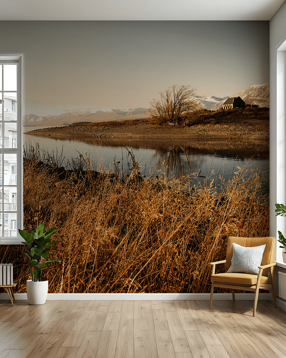 Vneste do svého domova jedinečný pocit klidu s fototapetou „Klid jezera“. Tento malebný výhled, zobrazující klidné vody jezera obklopeného zlatavými trávami a majestátními horami, vnáší do prostoru atmosféru klidu a relaxace. Jemné odstíny zlaté a modré a jemný odraz ve vodě vytvářejí dokonalé pozadí pro jakýkoli interiér a dodávají mu jedinečný, přírodní charakter.