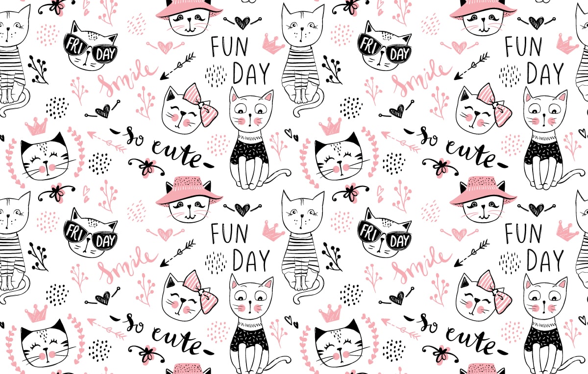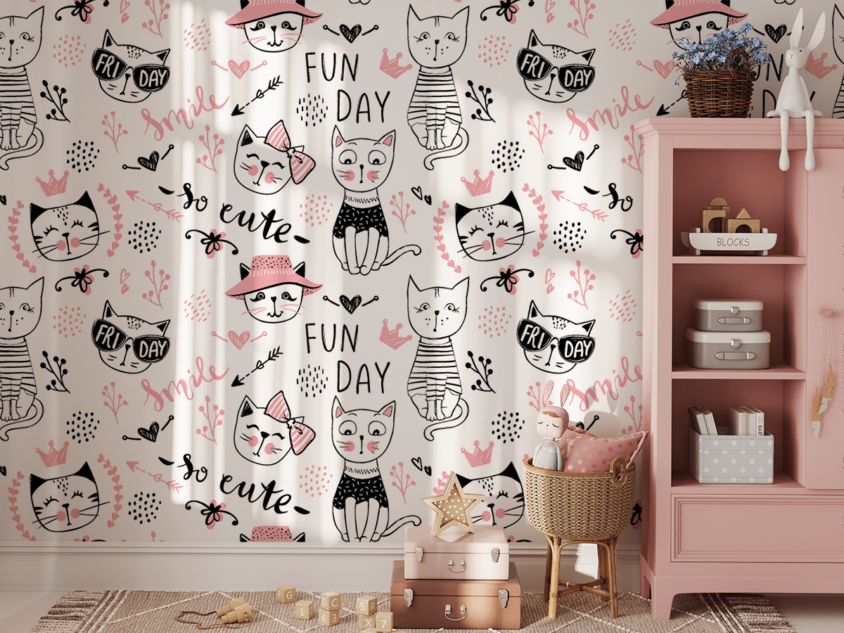 Vneste do dětského pokoje jedinečnou atmosféru s fototapetou „Kočičí svět radosti“. Tento veselý vzor s legračními, kreslenými kočkami v jemných růžových a černých odstínech evokuje bezstarostnost a pozitivní emoce a vytváří přátelský a inspirativní prostor. Přátelské kočky, nápisy a drobné detaily dodávají interiéru úsměv a kreativitu.