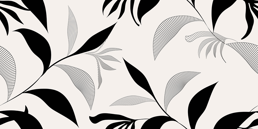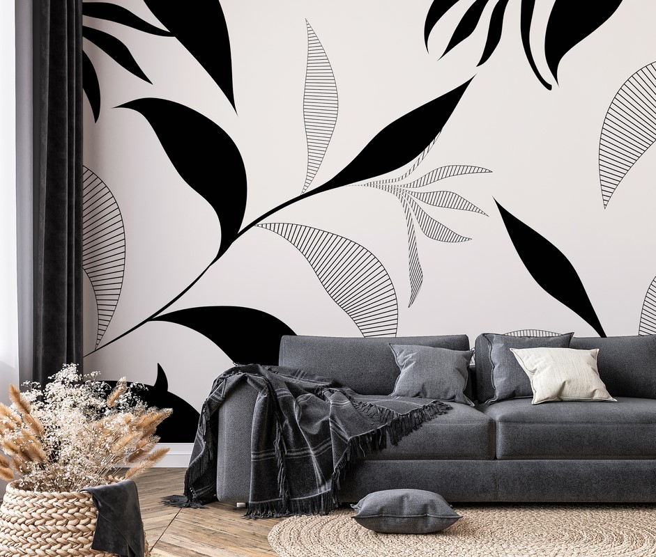 Štítky: černá, dekorace na zeď, kontrast, listy, rostlinný akcent v interiéru, tapeta do obývacího pokoje, tapeta s listy, tapeta s rostlinným motivem