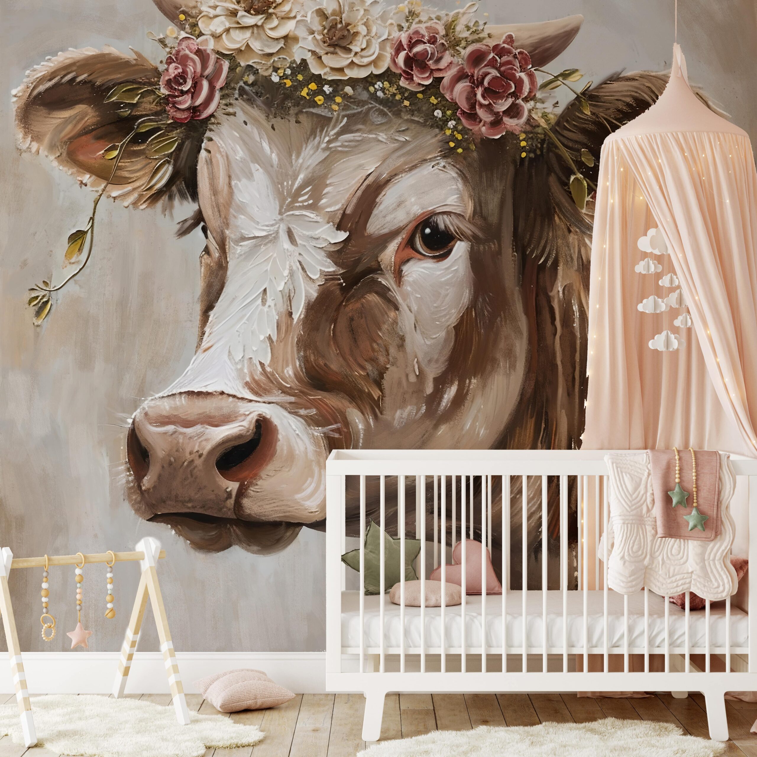Vneste do dětského pokoje kouzelnou atmosféru s fototapetou „Květinová louka“. Tento okouzlující vzor zobrazující přátelskou krávu s květinovým věncem je dokonalou kombinací idylického kouzla, pastelových barev a dětské fantazie. Jemné tahy štětcem, jemné barvy a veselý zvířecí motiv vytvářejí útulný prostor, kde se každé dítě bude cítit bezpečně a radostně.