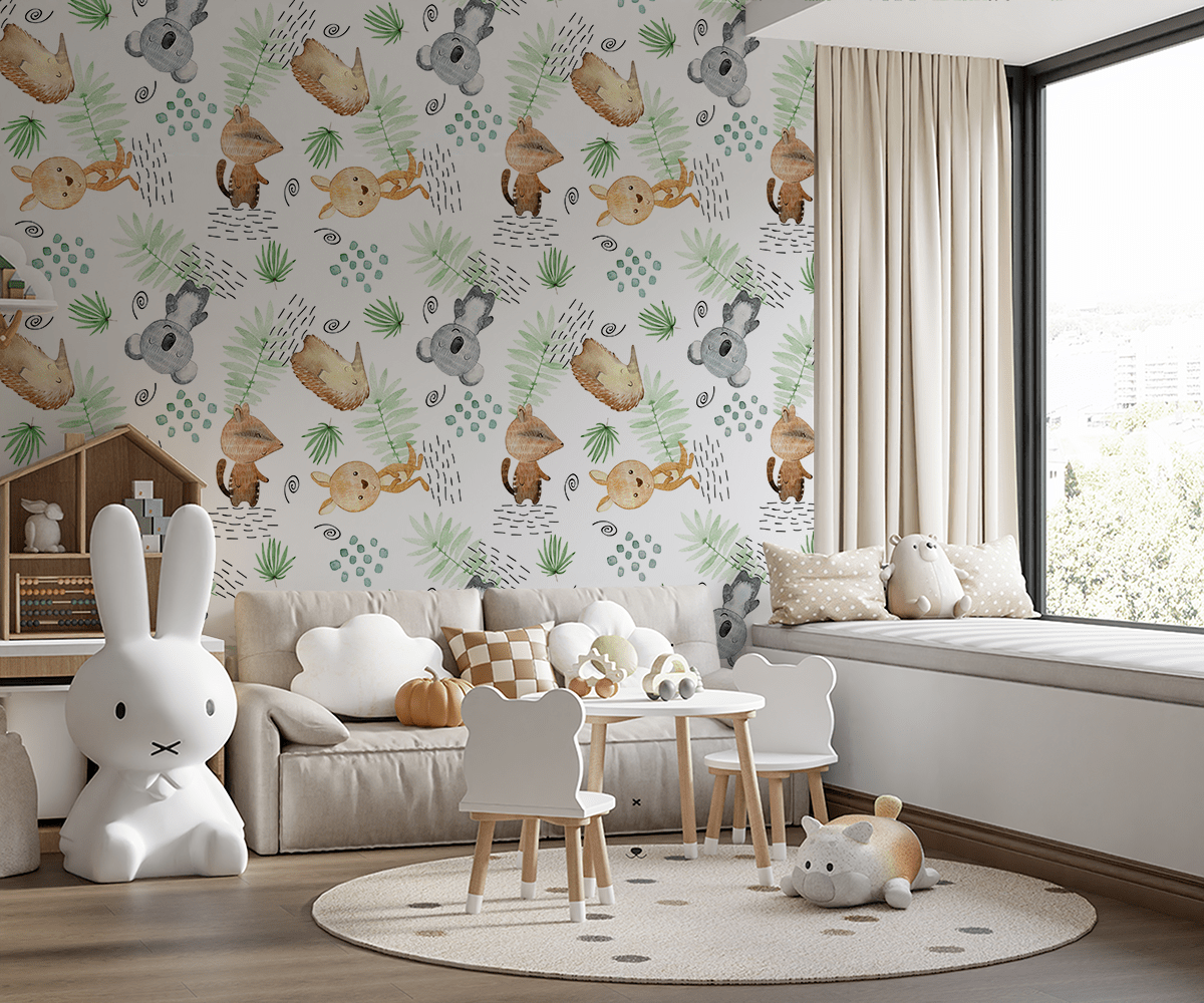 Oživte svůj interiér fototapetou „Lesní roztomilí z protinožců“ – plnou tepla, zábavy a pohádkového kouzla. Tento jedinečný vzor s ručně malovanými zvířaty z australských lesů – koalou, klokanem, ježounou a bandikutem – vás přenese do světa dětské fantazie a přírody plné harmonie. Pastelová barevná paleta, akvarelové listy a jemné detaily vytvářejí klidnou, ale zároveň radostnou atmosféru.