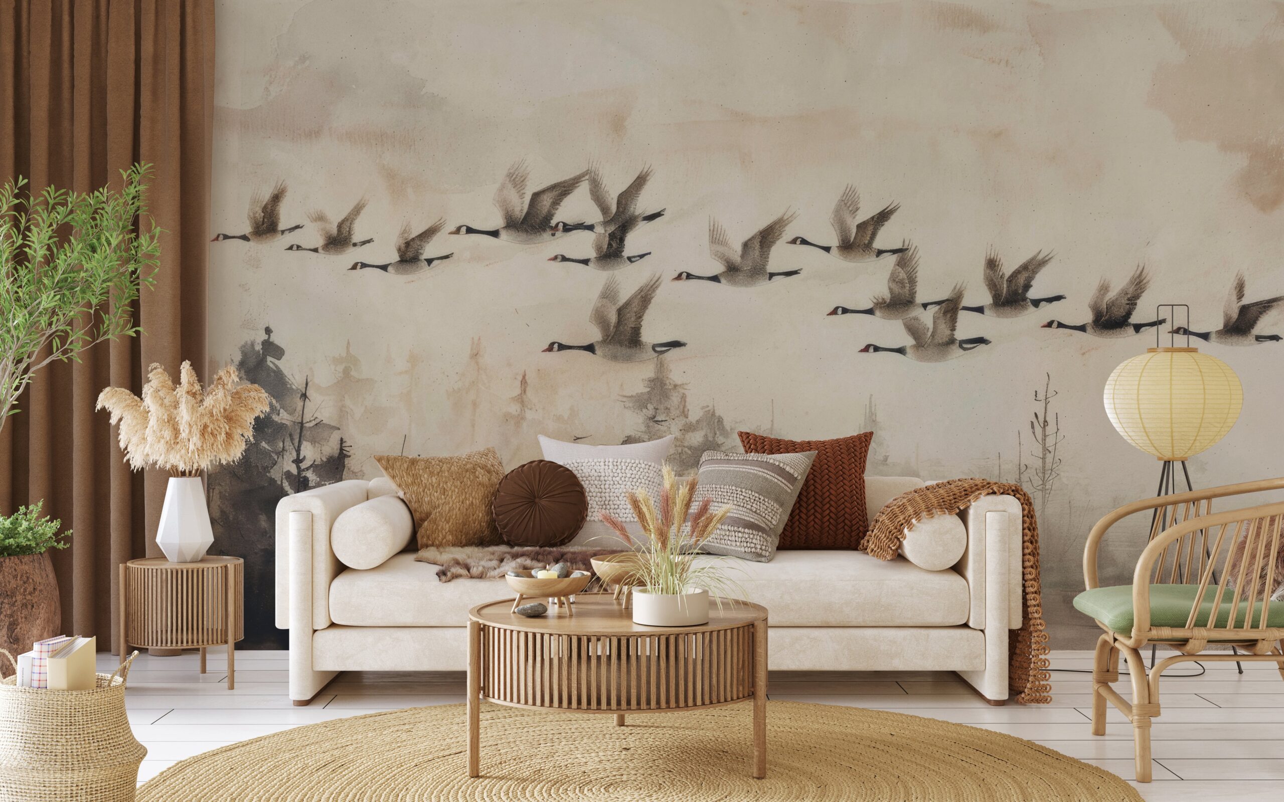 Vneste do svého interiéru jedinečnou a neopakovatelnou atmosféru s fototapetou „Let“. Jemný motiv hus letících nad mlhavým lesem je nejen krásnou dekorací, ale také symbolem svobody, míru a přirozené rovnováhy. Tento jemný vzor kombinuje estetiku přírody s minimalistickým stylem a vytváří prostor plný svěžesti a něhy. Tlumené barvy a jemné, rozmazané detaily harmonicky zapadají do moderních i klasických interiérových designů a obohacují je o jemný umělecký akcent.