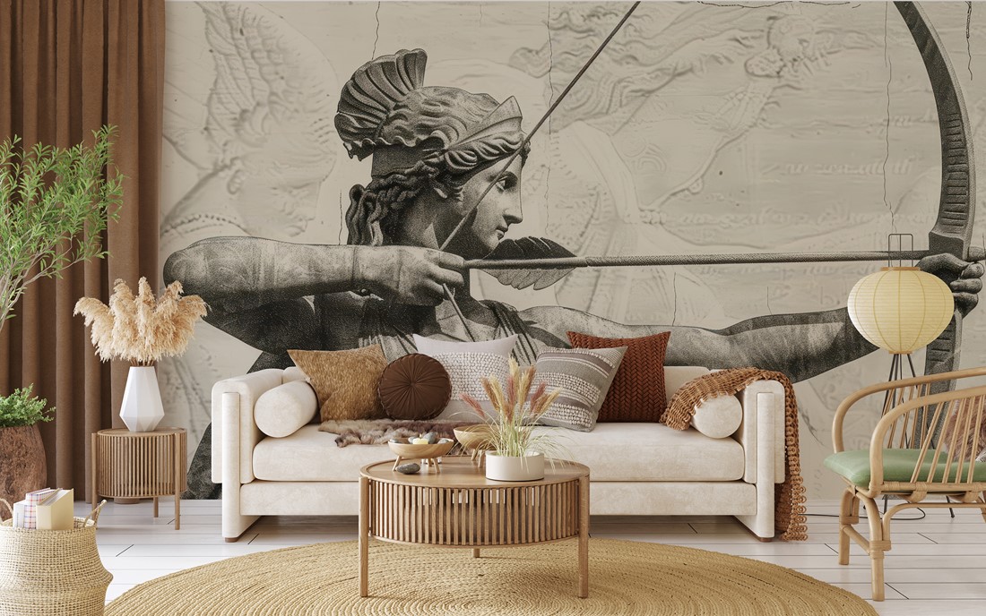 Vneste do svého interiéru nadčasový charakter a mytologickou symboliku s fototapetou „Lukostřelec z mytologie“. Tato mimořádná kompozice je inspirována estetikou antických soch a postavou Artemidy – řecké bohyně lovu, divoké přírody a ženské nezávislosti. Zachycený v koncentrovaném gestu se okamžik natažení luku stává symbolem odvahy, odhodlání a vnitřní harmonie.