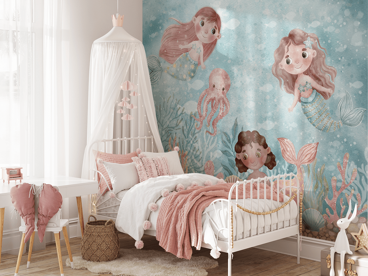 Proměňte dětský pokoj v barevný mořský svět s fototapetou „Mořské panny z korálové laguny“. Tato okouzlující ilustrace přenese nejmenší do kouzelného světa plného veselých mořských panen, lesklých mušlí a přátelských mořských tvorů. Pastelové barvy, jemné detaily a pohádkový styl vytvářejí atmosféru snů, zábavy a dobrodružství pod vodou.