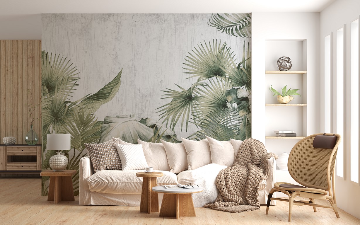 Tato nástěnná malba je dokonalým způsobem, jak osvěžit interiér a vnést do něj exotickou atmosféru. Palmové listy na šedém pozadí dodávají místnosti moderní a stylový vzhled, který jistě upoutá pozornost hostů.
