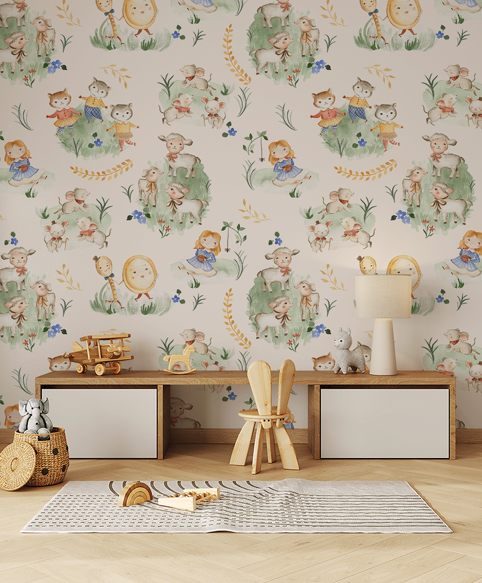 Proměňte pokoj svého dítěte v kouzelnou zemi s fototapetou „Pohádková louka pro batolata“. Tento ručně malovaný vzor plný roztomilých zvířátek, veselých postaviček a něžných barev přenese ty nejmenší do světa klasických pohádek a ukolébavek. Motivy inspirované říkankami – jako jsou tančící koťata, jehňátka a myšky – vytvářejí atmosféru bezstarostnosti, radosti a tepla.