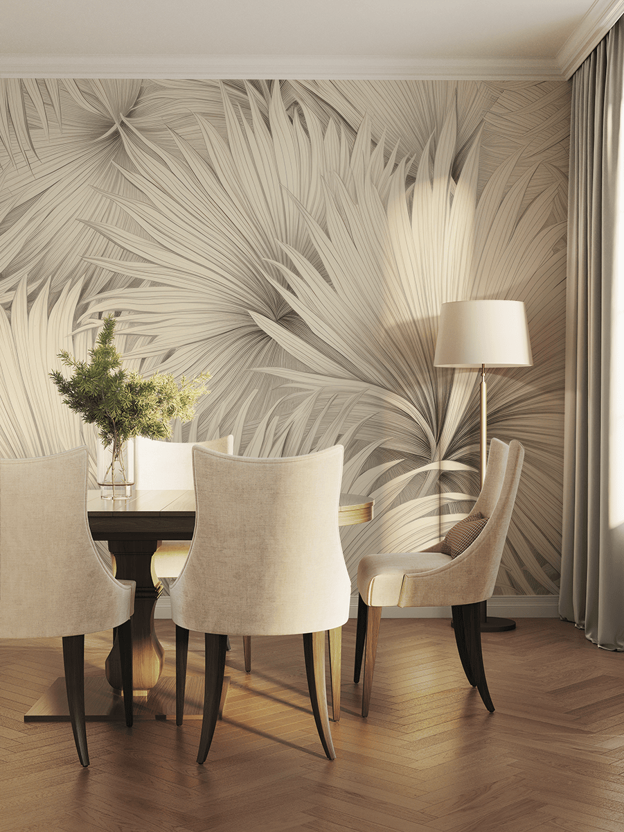Objevte jemnou krásu přírody s fototapetou „Pouštní vítr“. Tento éterický, organicky inspirovaný vzor evokuje jemný pohyb suchého listí unášeného pouštním vánkem. Světlá, tlumená barevná paleta a jemné linie vnášejí do vašeho interiéru pocit prostoru, lehkosti a klidu.