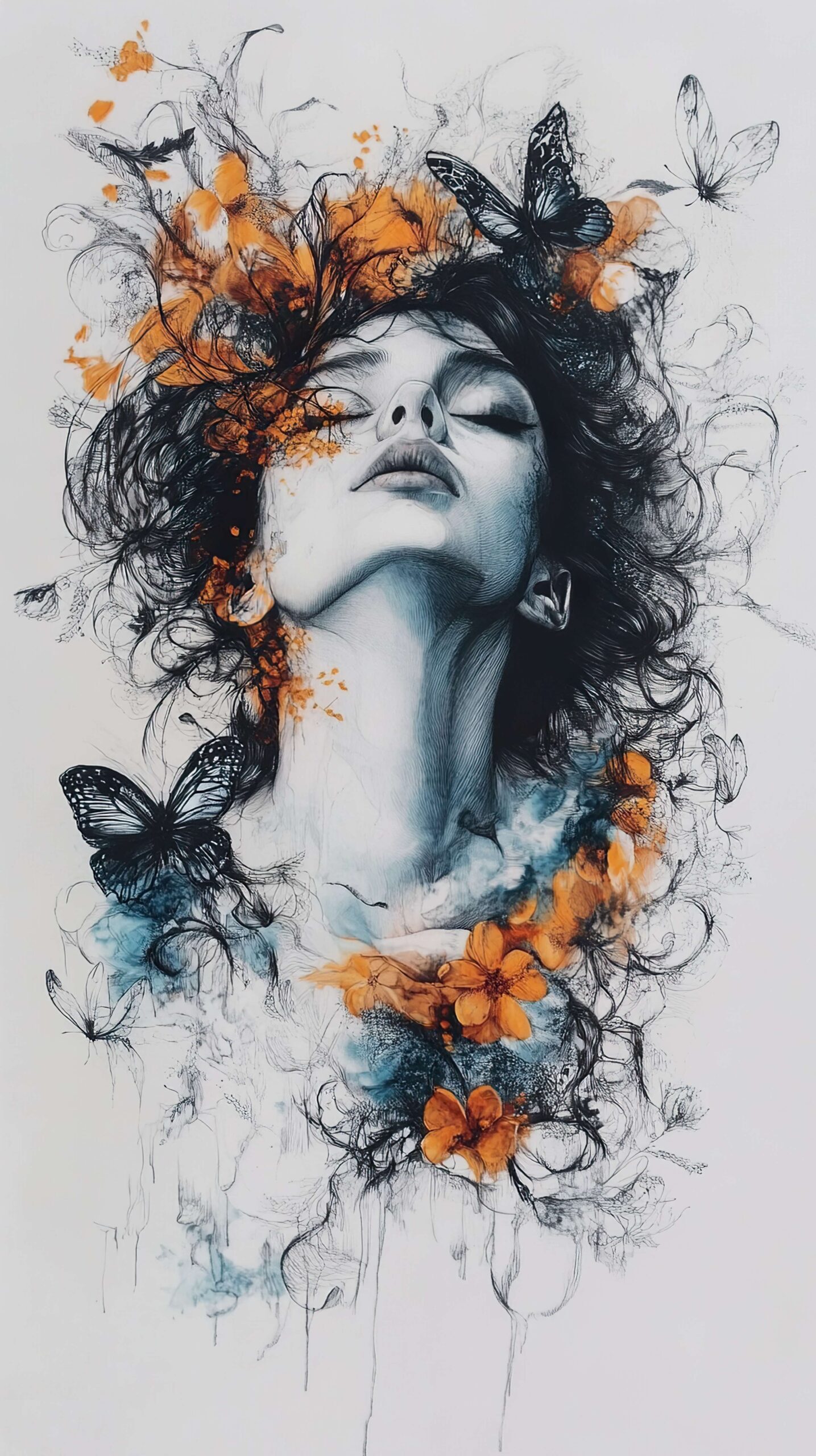 Vneste do svého interiéru jedinečnou atmosféru s touto fototapetou. Tento dojemný umělecký portrét ženy obklopené motýly a květinami kombinuje dynamickou skicu s barevnými záblesky a vytváří tak kompozici plnou emocí, pohybu a lehkosti. Kombinace kontrastních barev – černé, oranžové a modré – dodává prostoru výraznost a hloubku.