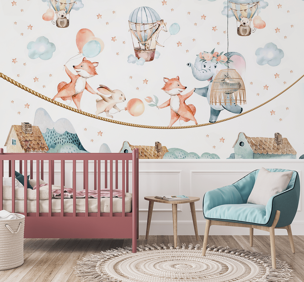 Vneste do dětského pokoje jedinečný svět plný barevných balónků, roztomilých zvířátek a hebkých obláčků s fototapetou „Chůze po obláčcích“. Tento jemný, pastelový vzor vás přenese do země fantazie, kde je každý den plný zábavy a přátelství. Jasné barvy a něžné tvary vytvářejí atmosféru klidu a bezstarostnosti, ideální pro ty nejmenší.