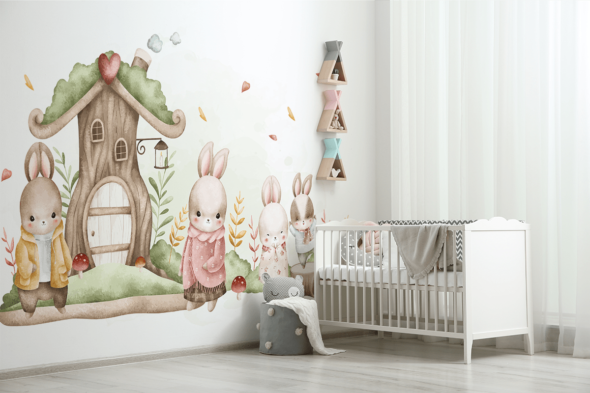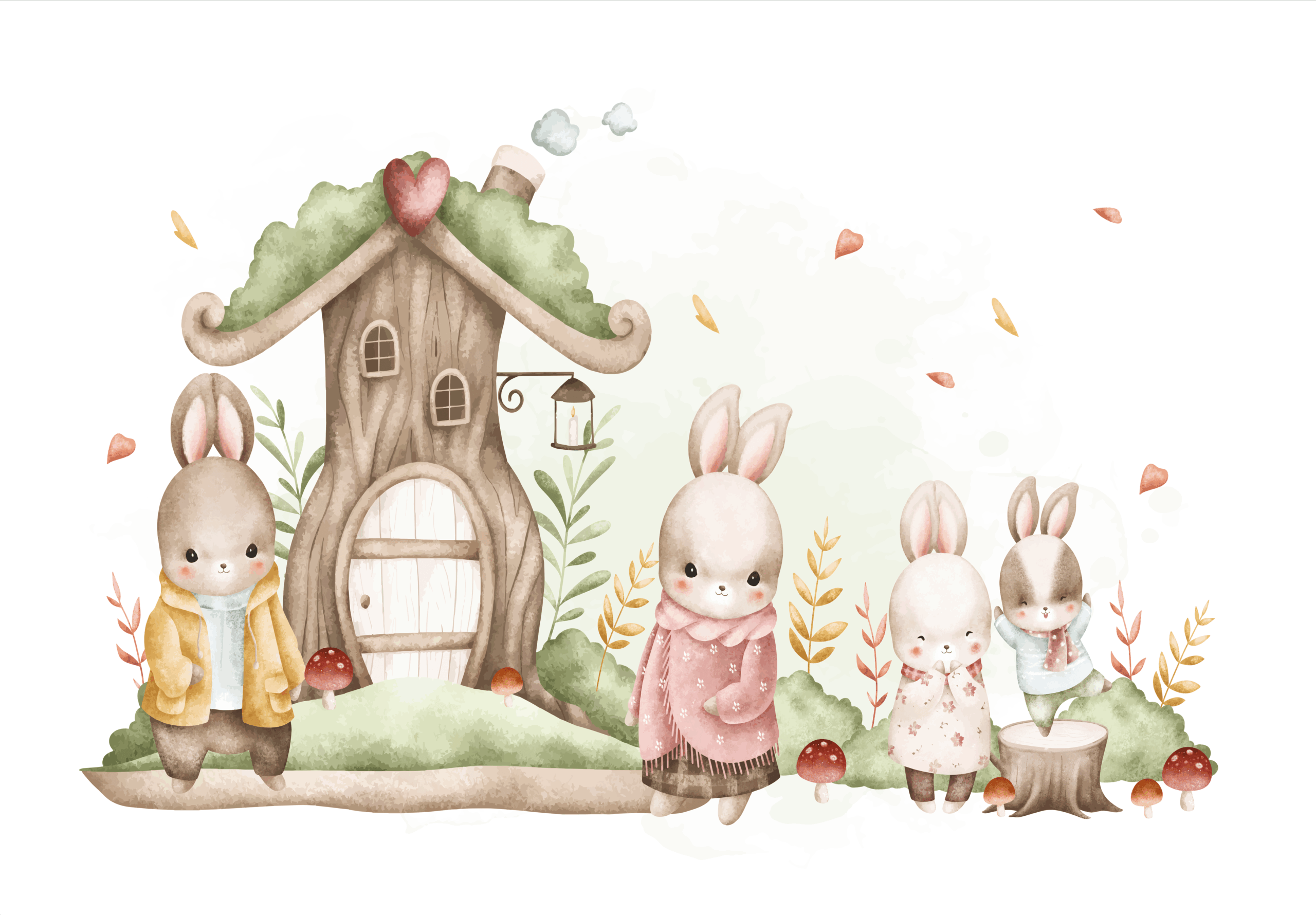 Vneste do dětského pokoje teplou a radostnou atmosféru s ilustrací „Rodinka lesních zajíčků“. Tento jemný pastelový obrázek zobrazuje přátelské zajíčky vedle útulné chaloupky v lese a vytváří tak kouzelnou atmosféru pro dětskou fantazii. Jemné detaily a jemné barvy se dokonale hodí do interiéru každého dítěte a přinesou klid a úsměv na tváři.