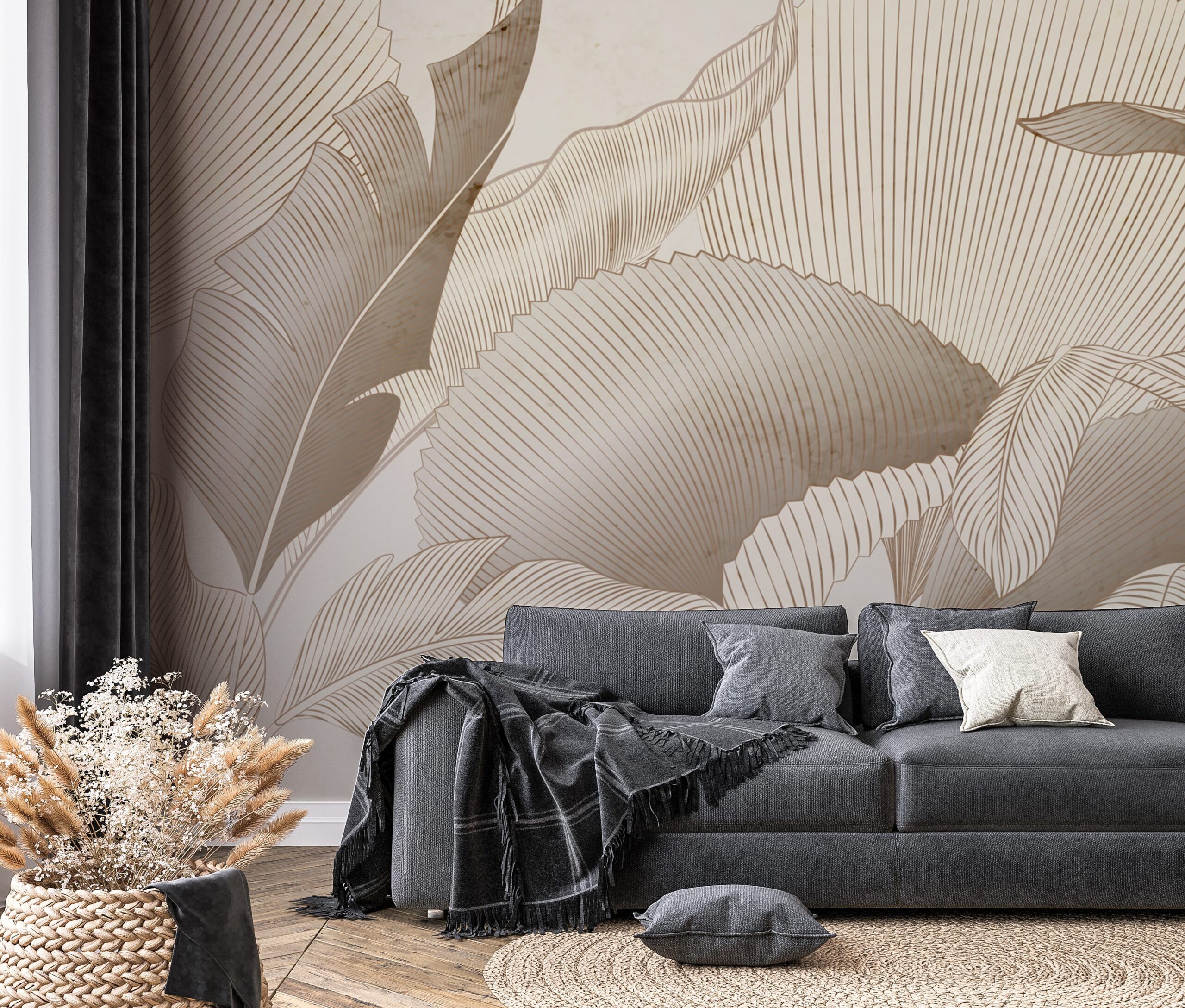 - Barvy, Boho, DO KOUPELNY, DO LOŽNICE, DO OBÝVACÍHO POKOJU, DO POKOJE, DO PŘEDSÍNĚ, Fototapety, Odstíny hnědé a béžové, Styl, TROPICKÉ LISTY