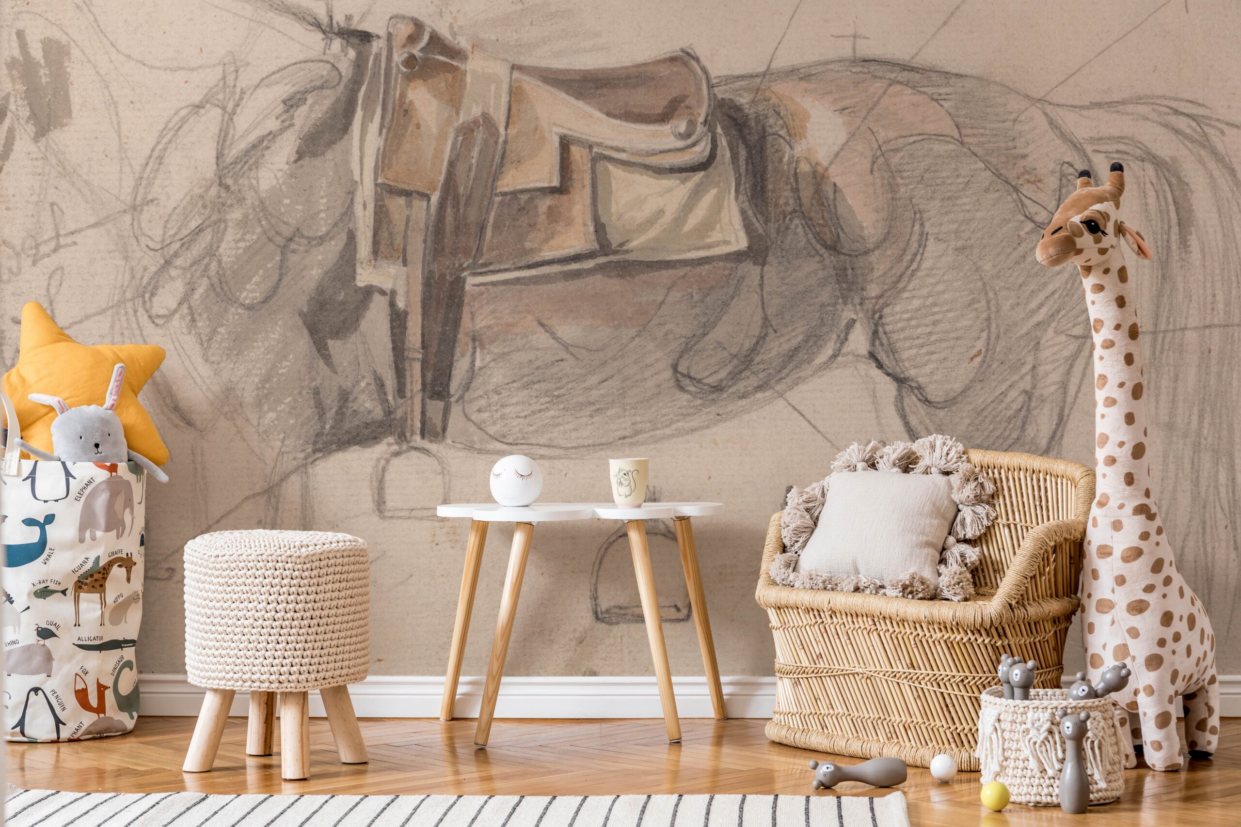 Přeneste své děti do světa fantazie s fototapetou „Skica se sedlem“. Tato ručně vyrobená kresba koně se sedlem stimuluje kreativitu a rozvíjí lásku k přírodě a zvířatům. Jemné linie a jemné barvy vytvářejí přátelskou a klidnou atmosféru, ideální pro malé průzkumníky.