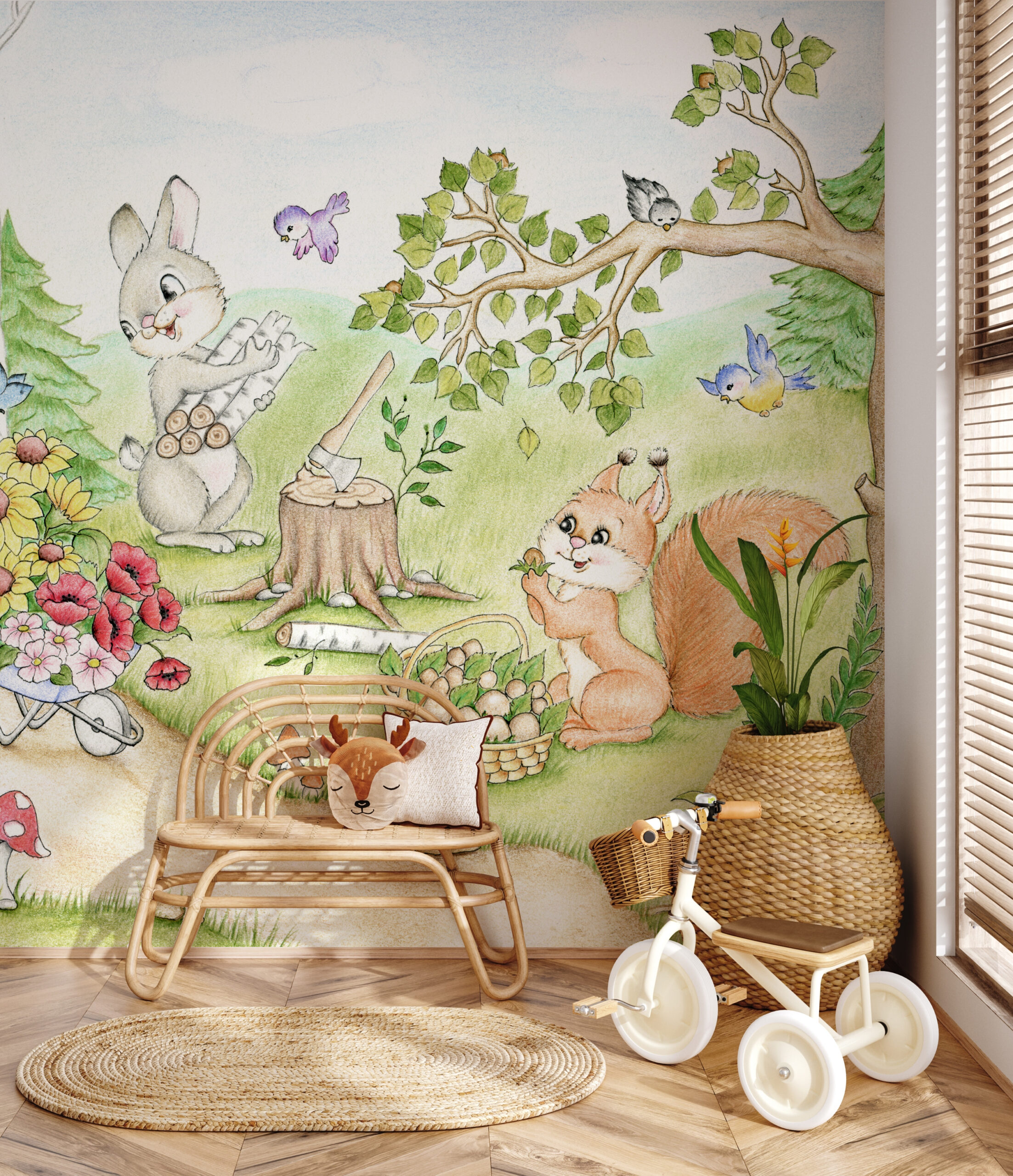 Přeneste dětský pokoj do kouzelného světa s fototapetou „Šťastný les“. Tato ilustrace plná teplých barev a usměvavých postaviček s přátelským ježkem, veselým králíčkem a okouzlující veverkou vytvoří atmosféru radosti, přátelství a bezstarostné hry v přírodě. Každý detail, od květin po barevné ptáky a motýly, vás zve k objevování a prozkoumávání krás přírody a vzbuzuje zvědavost a radost.