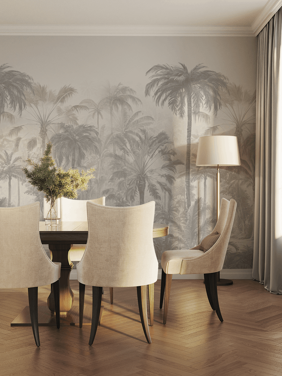 Vneste do svého interiéru atmosféru tropického klidu s fototapetou „Tajemství tropů“. Tento sofistikovaný, monochromatický vzor zobrazující bujné palmy připomíná exotické krajiny skryté v ranní mlze. Tlumená barevná paleta a jemné detaily vytvářejí harmonickou, lehce nostalgickou kompozici, která se dokonale hodí do klasických i moderních aranžmá.
