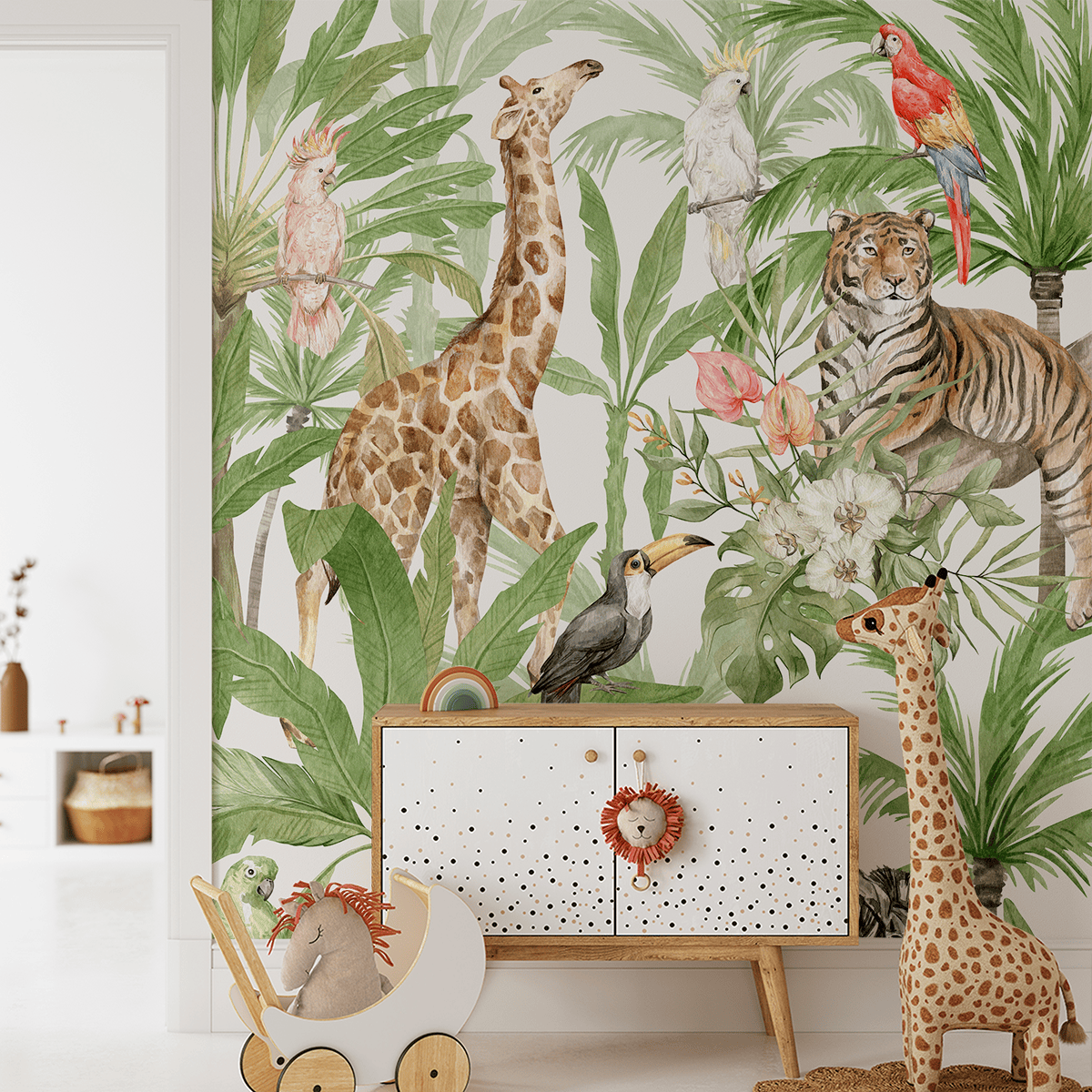 Ponořte se do kouzelného světa tropů s fototapetou „Tropická odysea“. Tato fototapeta plná barev a neobvyklých zvířat vás přenese do džungle, kde dominují exotičtí ptáci, nádherné rostliny a divoká zvířata, jako jsou zebry, žirafy a tygři. Každý detail této jedinečné dekorace hemží životem a vytváří radostnou atmosféru plnou dobrodružství a objevů.