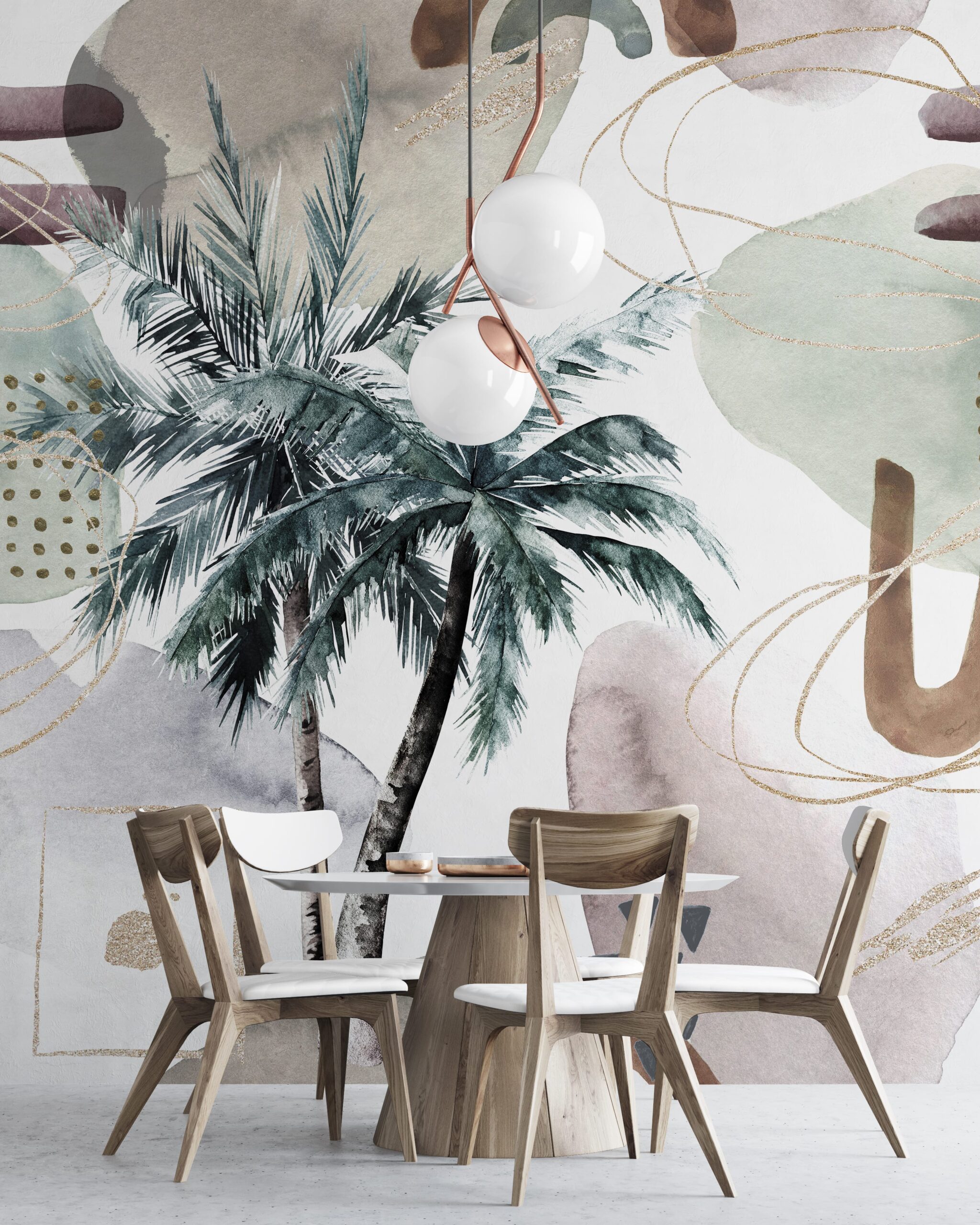 Vneste do svého interiéru nádech tropické lehkosti s fototapetou „Tropical Rhythm“. Kompozice palmových listů v kombinaci s abstraktními formami a tlumenou barevnou paletou vytváří jedinečnou kombinaci přírody a současného umění. Jemné přechody akvarelových barev a zlaté detaily dodávají celku sofistikovaný, ale zároveň ležérní charakter.