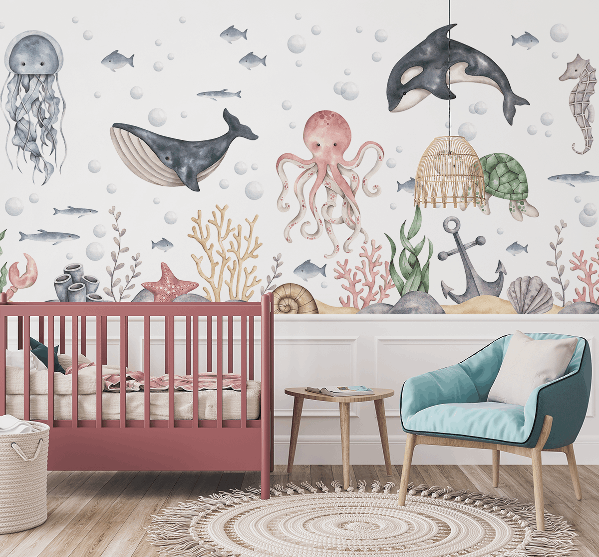 Je to víc než jen dekorace – je to barevné dobrodružství, které promění dětský pokoj v pohádkovou zemi plnou kamarádů z hlubin oceánu.