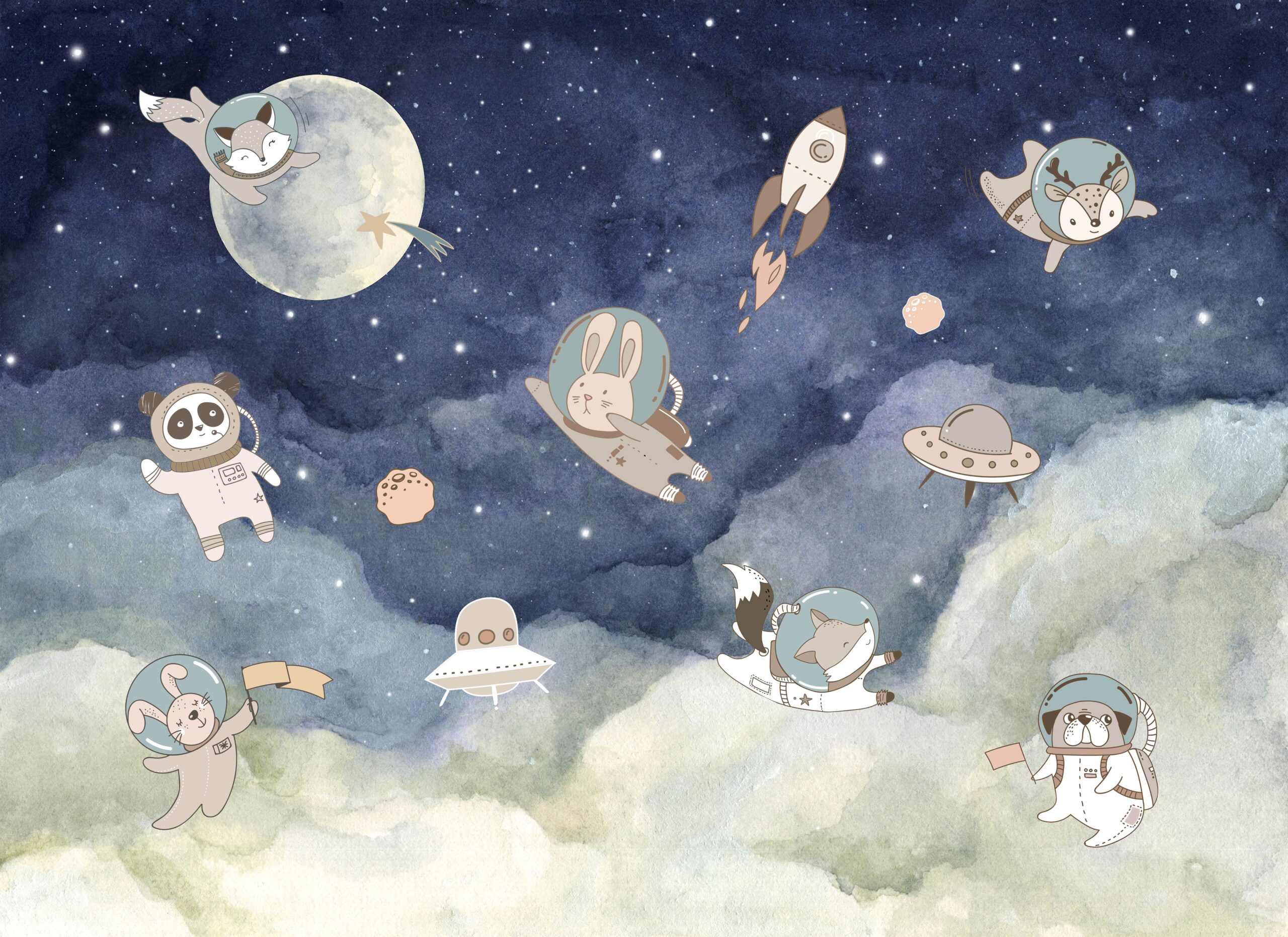 Fototapeta „Vesmírná zvířata“ – Kouzelná cesta do vesmíru plná roztomilých zvířátek a dětské fantazie