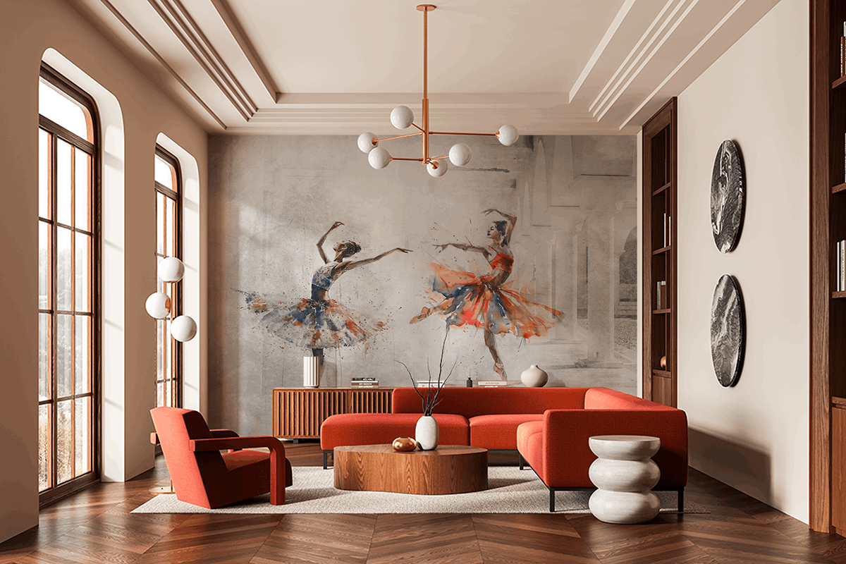 Toto je vynikající volba pro lidi, kteří si cení umění, pohybu a sofistikované estetiky, a dokonale se hodí do moderních i klasických aranžmá. Fototapeta zdůrazní jedinečnost obývacího pokoje, studia nebo uměleckého prostoru a vnese do něj harmonii a lehkost.