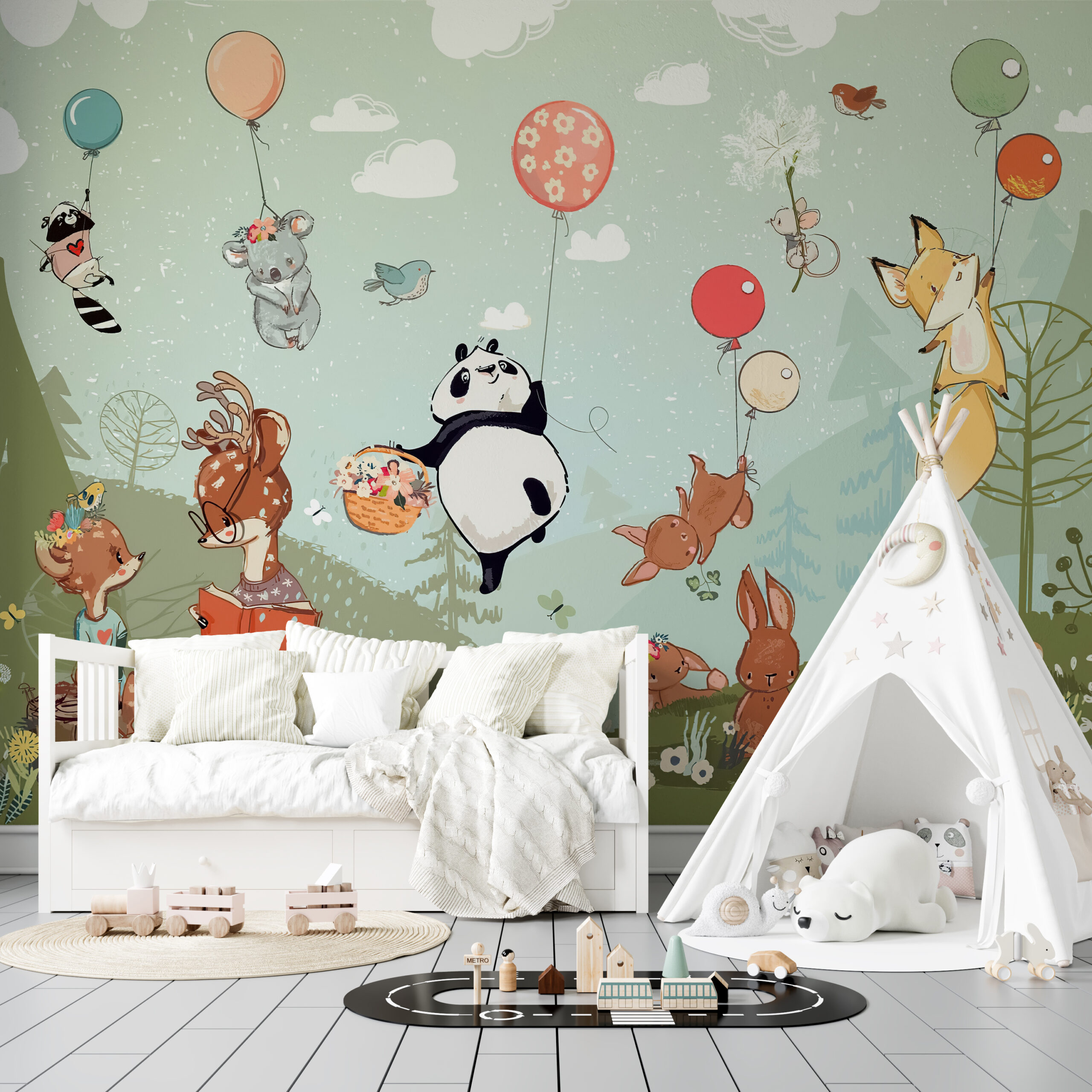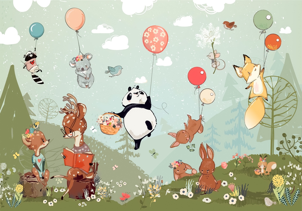 Na této nástěnné malbě vidíme lesní krajinu plnou barevných stromů, ptáků a zvířat. Děti si vesele hrají na louce a slunce se jemně prodírá větvemi stromů. To je ideální pro ty, kteří chtějí mít v interiéru dotek přírody.