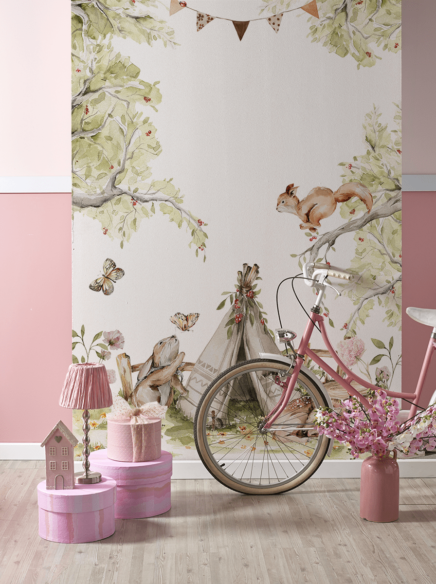 Motiv lesního tábora se stanem, veverkou, králíčkem, motýly a spícím jelenem podněcuje dětskou fantazii a vypráví krásný příběh o přátelství, objevování a trávení času společně v přírodě. Je to dekorace, která dokáže malé děti přenést do světa pohádek a snů, dodat jim pocit bezpečí a inspirovat je k kreativní hře.
