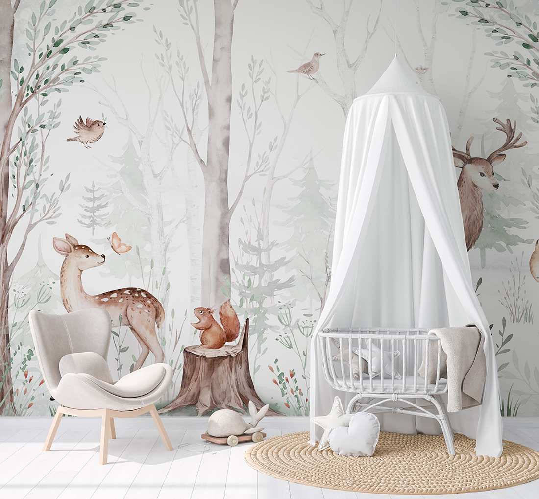 Příjemný přírodní motiv je ideální volbou pro rodiče, kteří hledají tlumený, harmonický interiér – přátelský a bezpečný pro nejmenší.