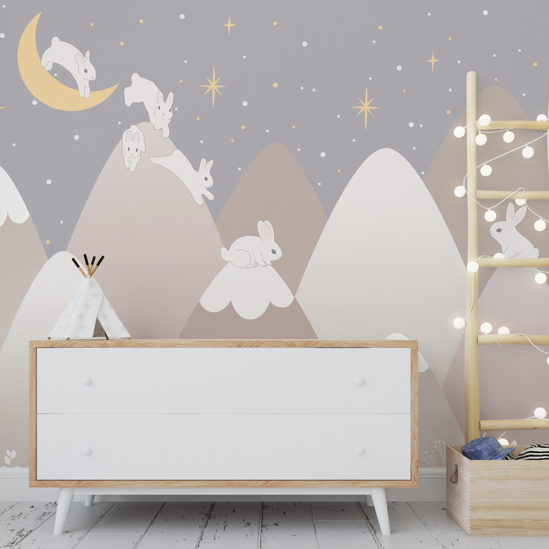 Nástěnná malba zobrazuje malebné horské krajiny, mezi nimiž jsou bílí chlupatí králíčci, kteří dodávají celkovému kouzlu a útulnosti. Díky tlumeným barvám a jemnému vzoru se tato nástěnná malba hodí do mnoha designových stylů.