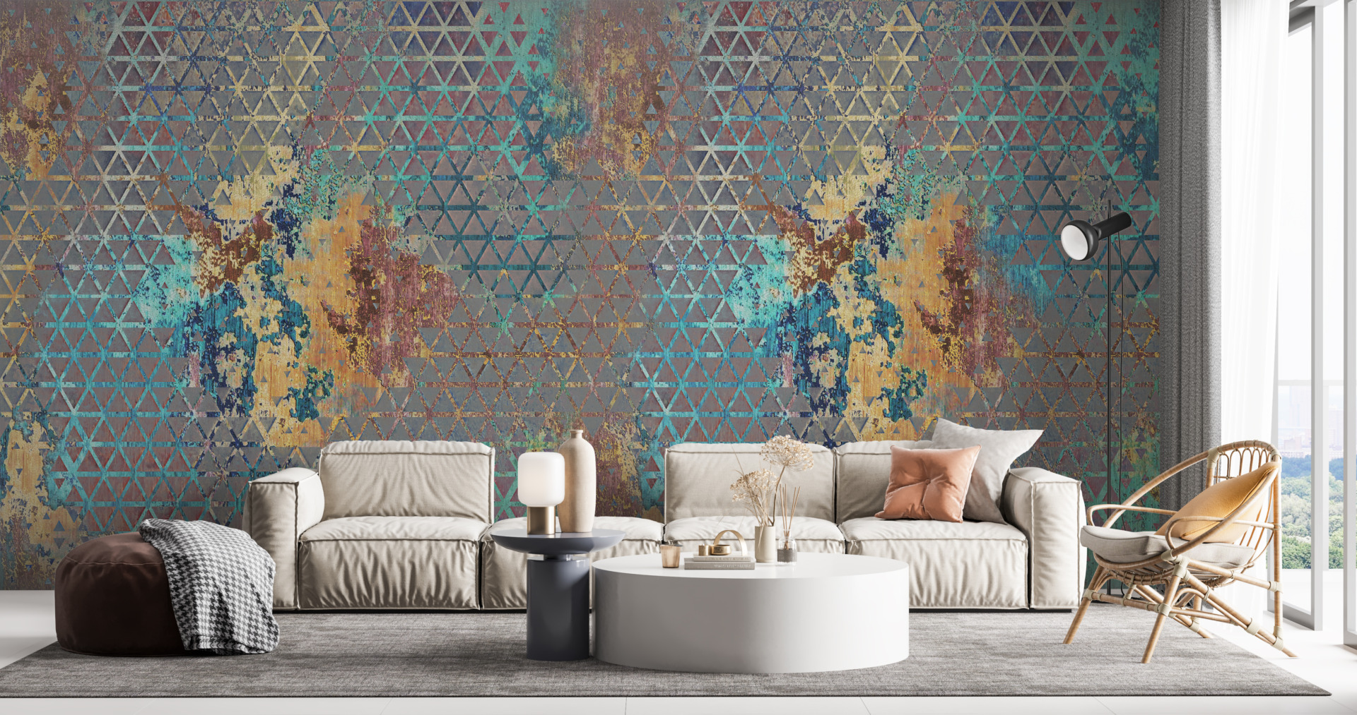Dvě skvrny na trojúhelnících jsou poutavým vzorem, který dodá interiéru dynamiku. Geometrické tvary a originální barevné kombinace učiní z této nástěnné malby ústřední bod každého uspořádání.