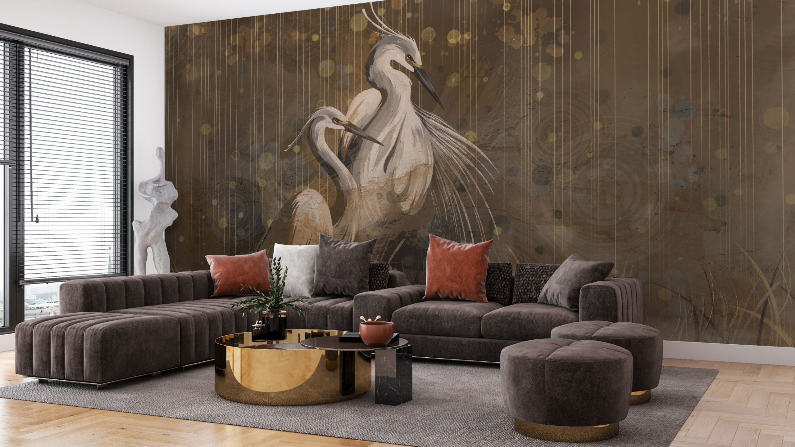 Hodí se do obývacího pokoje, ložnice, ale i do pracovny nebo restaurace. Fototapeta Crane Pair s jedinečným designem dodá každé místnosti jedinečný nádech.