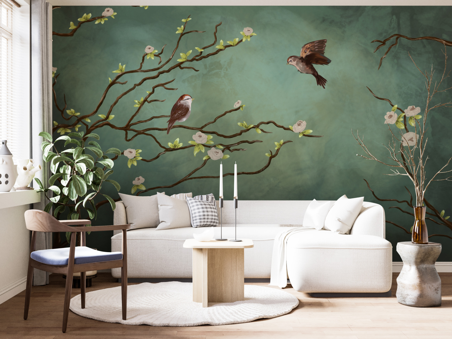 Nástěnná malba dvojice ptáků na rozkvetlém stromě