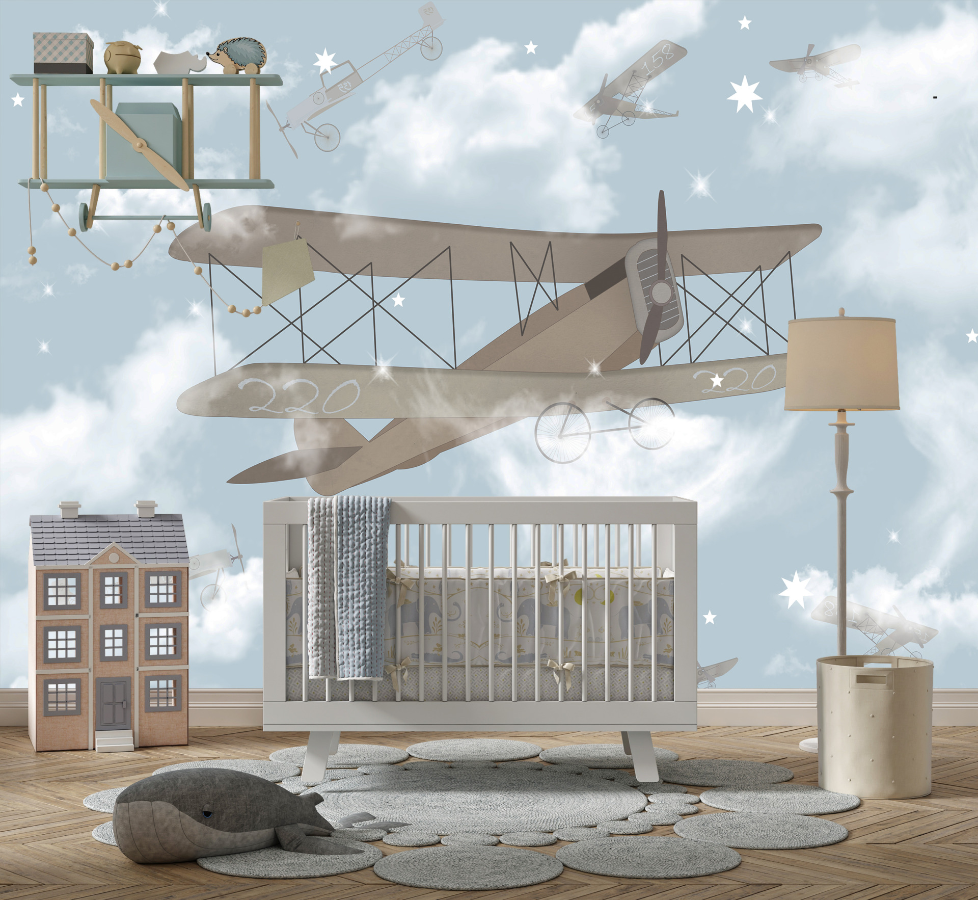 Pokud hledáte originální dekoraci do svého interiéru, je tato nástěnná malba ideální volbou. Je na něm vyobrazen dvouplošník vznášející se v mlžném prostředí, což mu dodává tajemný půvab. Vytvořte si doma jedinečnou atmosféru pomocí této nástěnné malby.