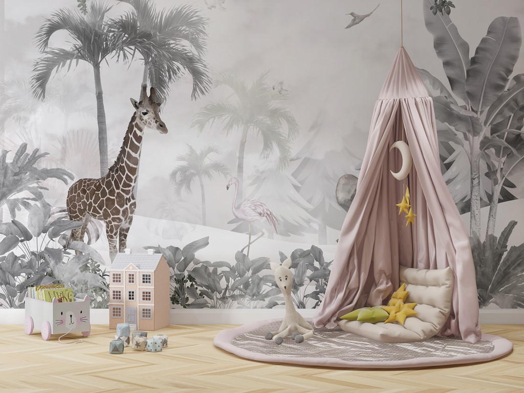 Stěny v dětském pokoji mohou být dokončeny mnoha způsoby. Navrhovaná nástěnná malba bude fungovat opravdu dobře. Jsou na něm exotická zvířata zahalená do jemné mlhy. Díky tomu působí velmi klidným dojmem, což znamená, že u dětí nevyvolávají úzkost. K tomu se přidává dominantní šedá barva, která umocňuje efekt. Nástěnná malba byla navržena tak, aby ji bylo možné úspěšně použít v dívčím i chlapeckém pokoji. Zaujme kvalitním zpracováním a výjimečnou odolností.