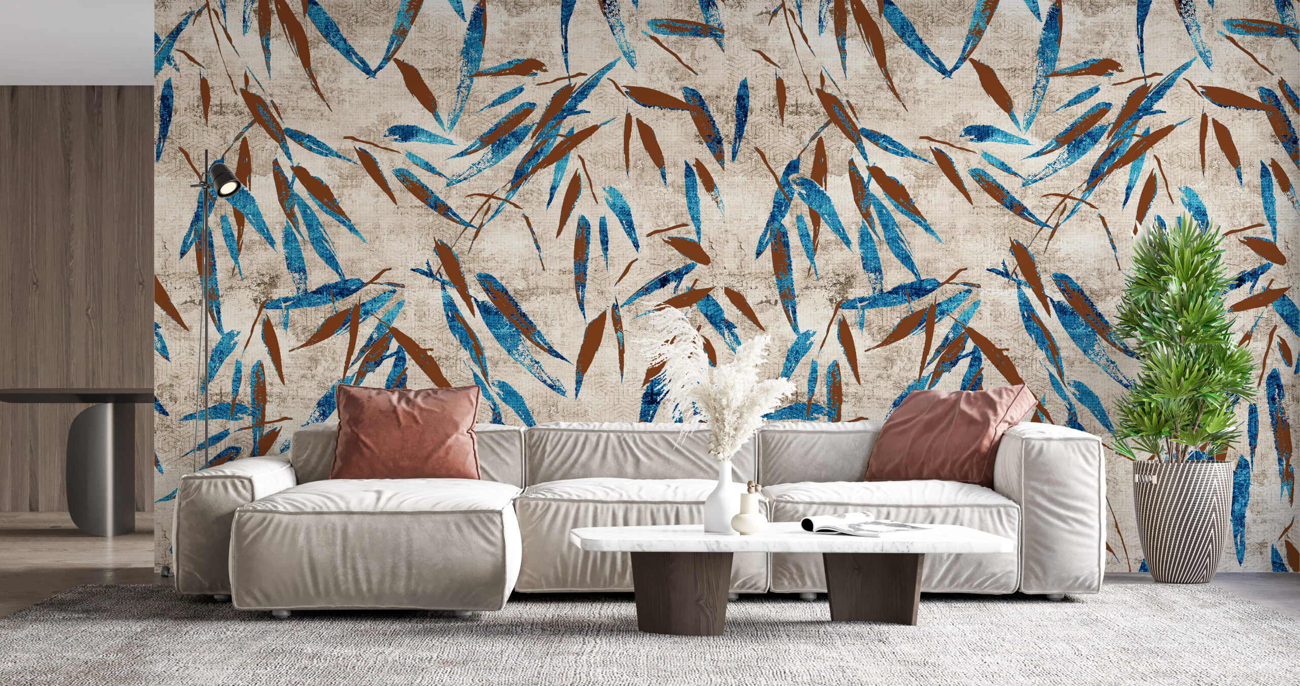 Tato okouzlující fototapeta zobrazuje jemné modré a hnědé listy, které dodají vašemu interiéru jemný a příjemný vzhled. Tyto listy jsou uspořádány do harmonického vzoru, který působí velmi elegantně a přirozeně.