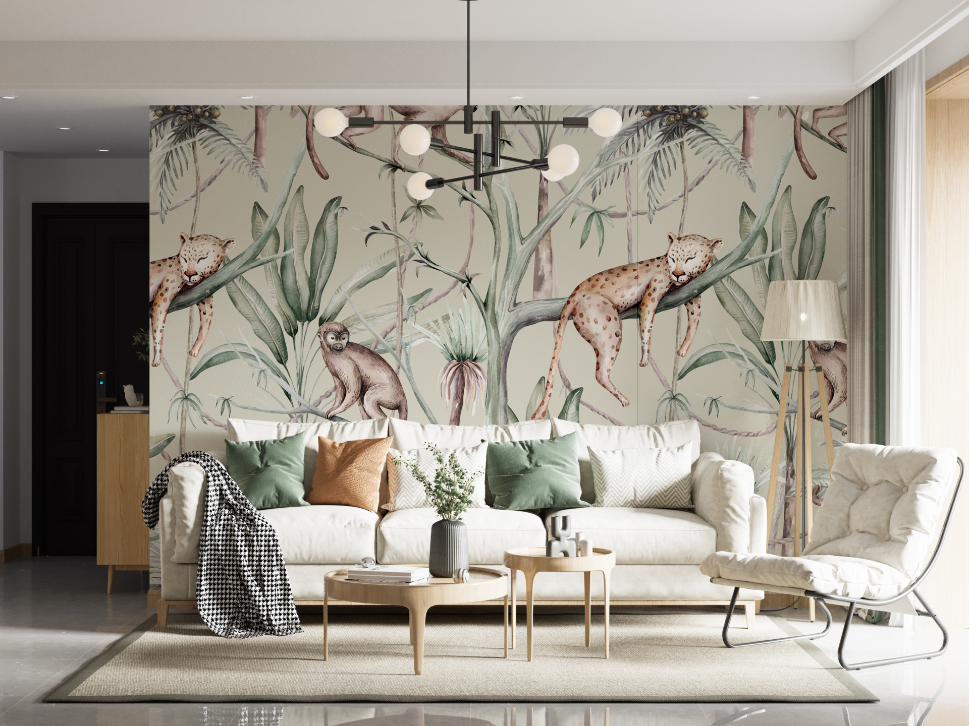 Přeneste se do džungle díky této okouzlující nástěnné malbě s motivem spícího jaguára a opic. Tato krásná kompozice dodá vašemu interiéru tropickou atmosféru a učiní ho jedinečným. Ideální do ložnice, obývacího pokoje nebo pracovny – ať už ho umístíte kamkoli, vytvoří úžasnou atmosféru.