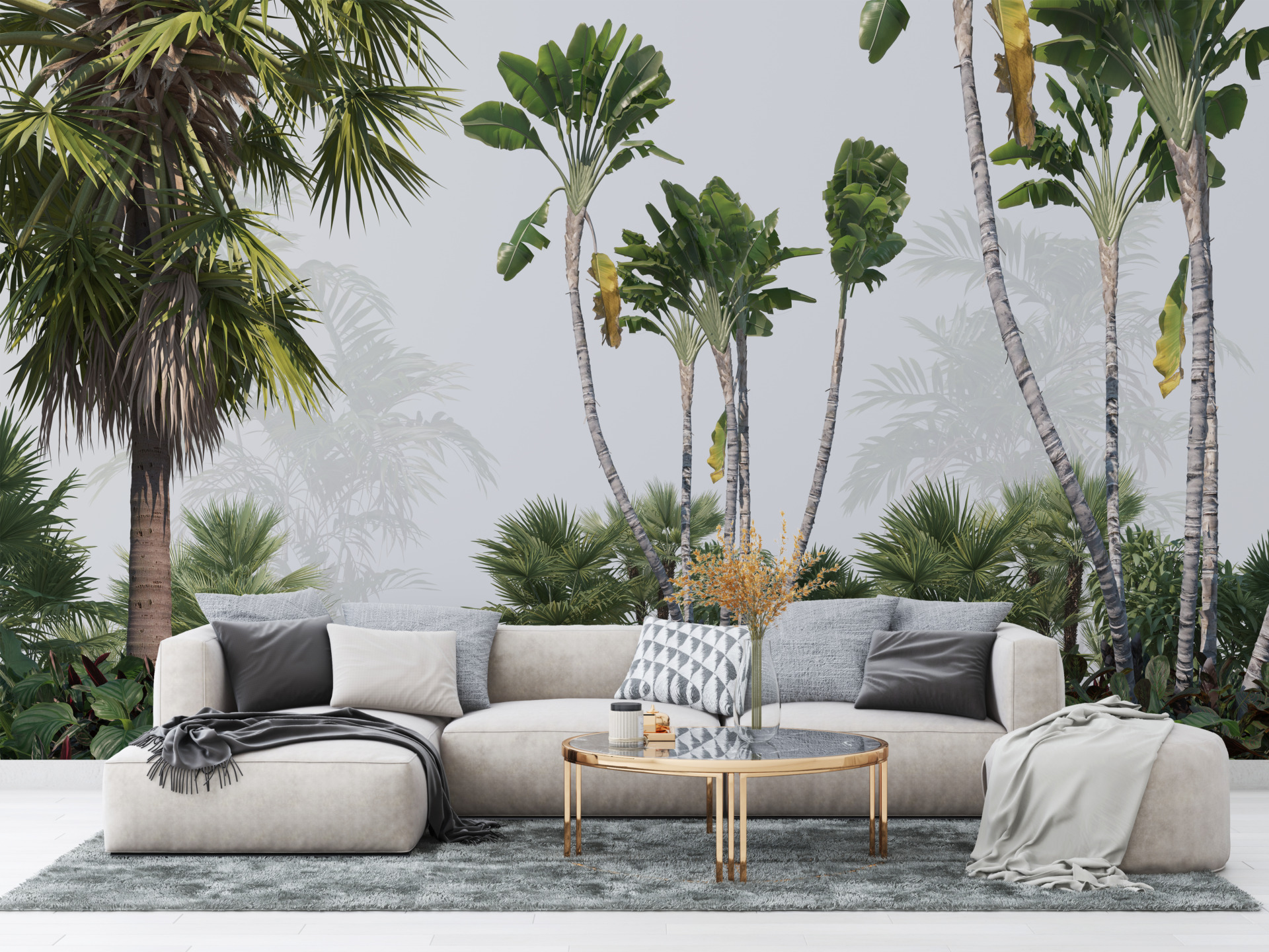 Nástěnná malba tropické zeleně a mlhy