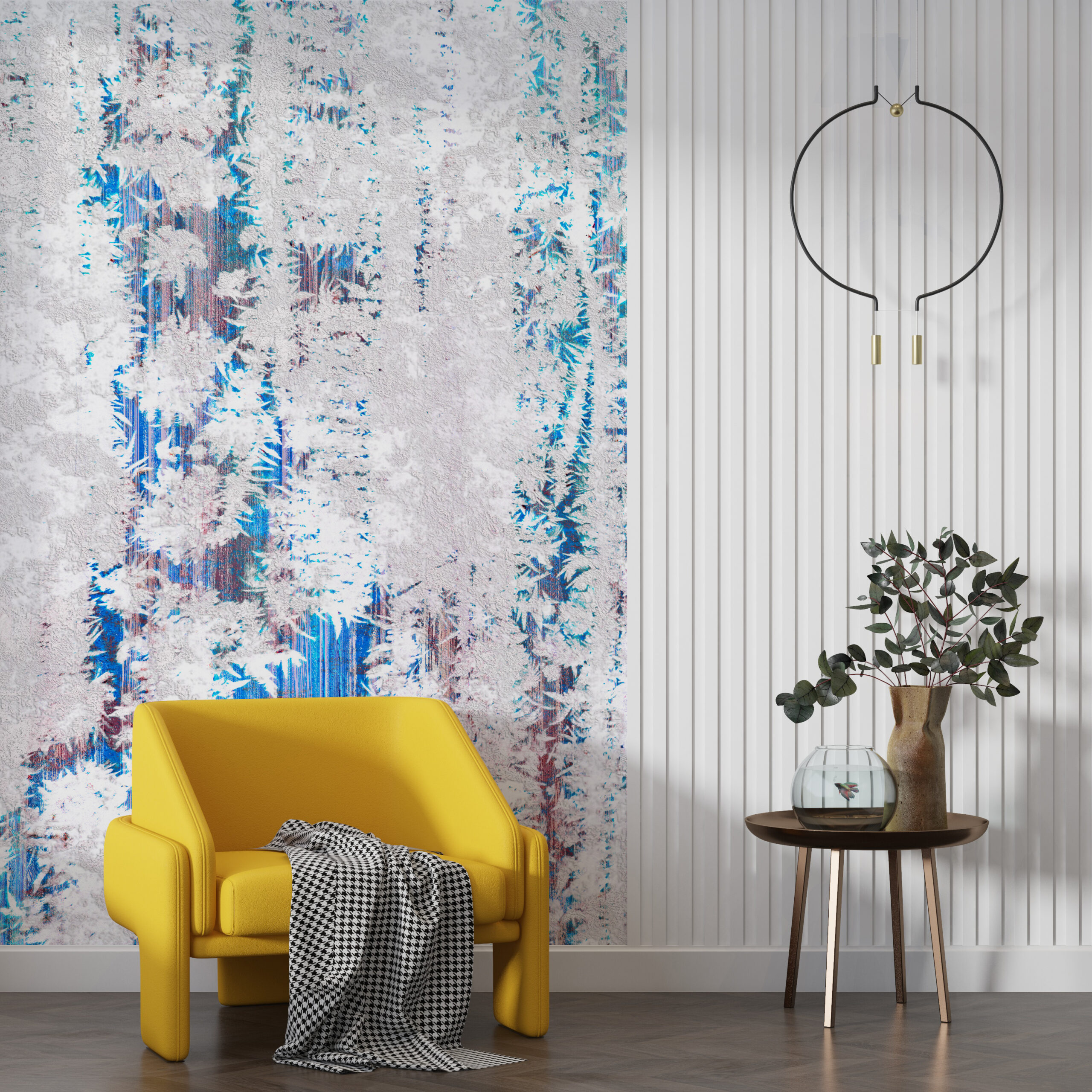 Tato krásná nástěnná malba je dokonalým způsobem, jak osvěžit váš interiér a dodat mu eleganci. Bílá a modrá barva působí svěže a lehce, takže je ideální volbou pro ložnici, obývací pokoj nebo i kancelář.