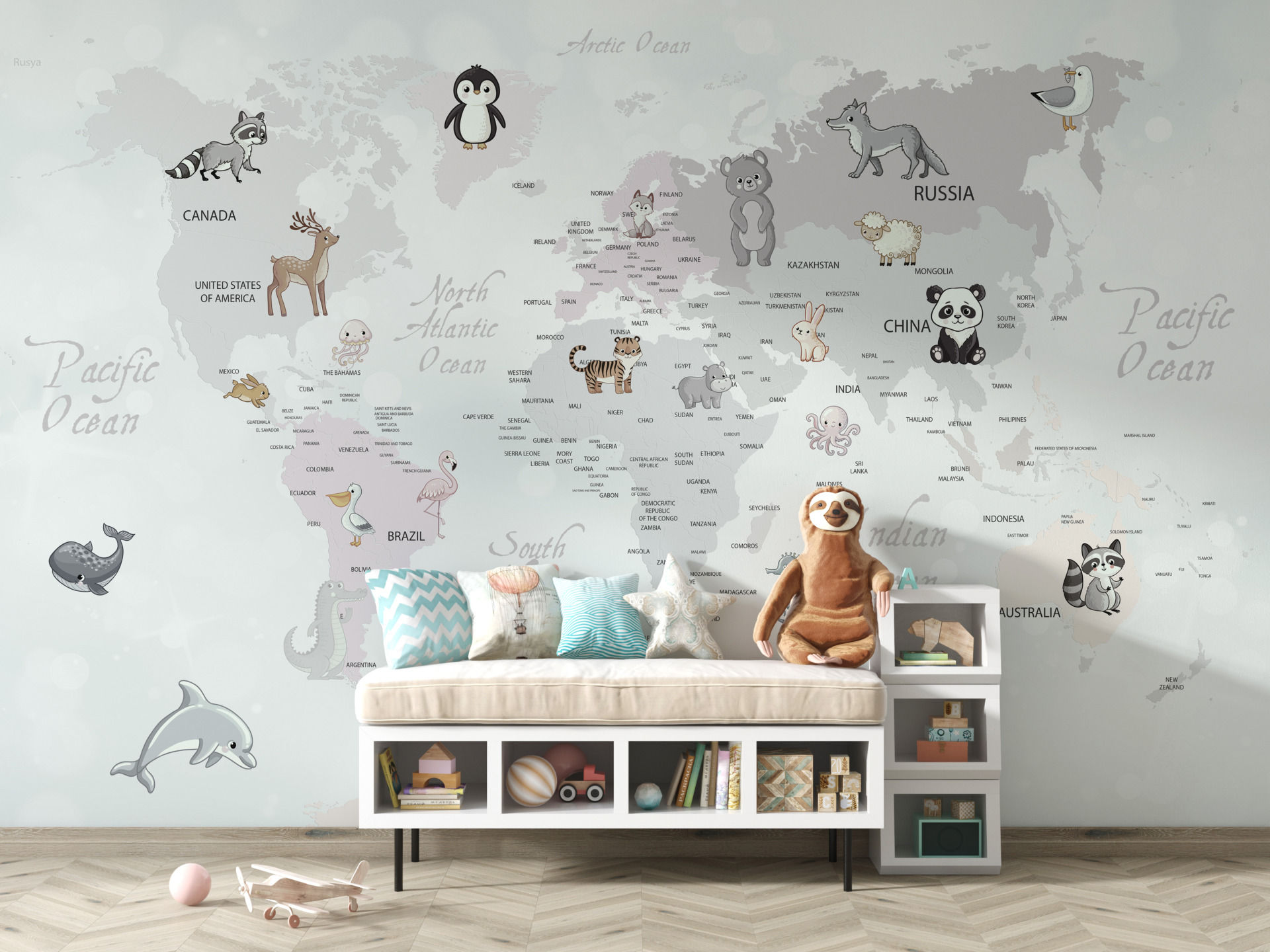 Tato krásná nástěnná malba je dokonalým způsobem, jak dodat barvu a charakter každé místnosti. Zobrazuje mapu světa s různými zvířaty z celého světa.